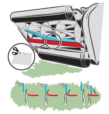 A cylinder mower cuts using a series of sharp spiral rotating blades. The rotating cylinder traps the blades of grass between its spinning blades and a stationary bottom blade, producing a precision, scissor-like cutting action.